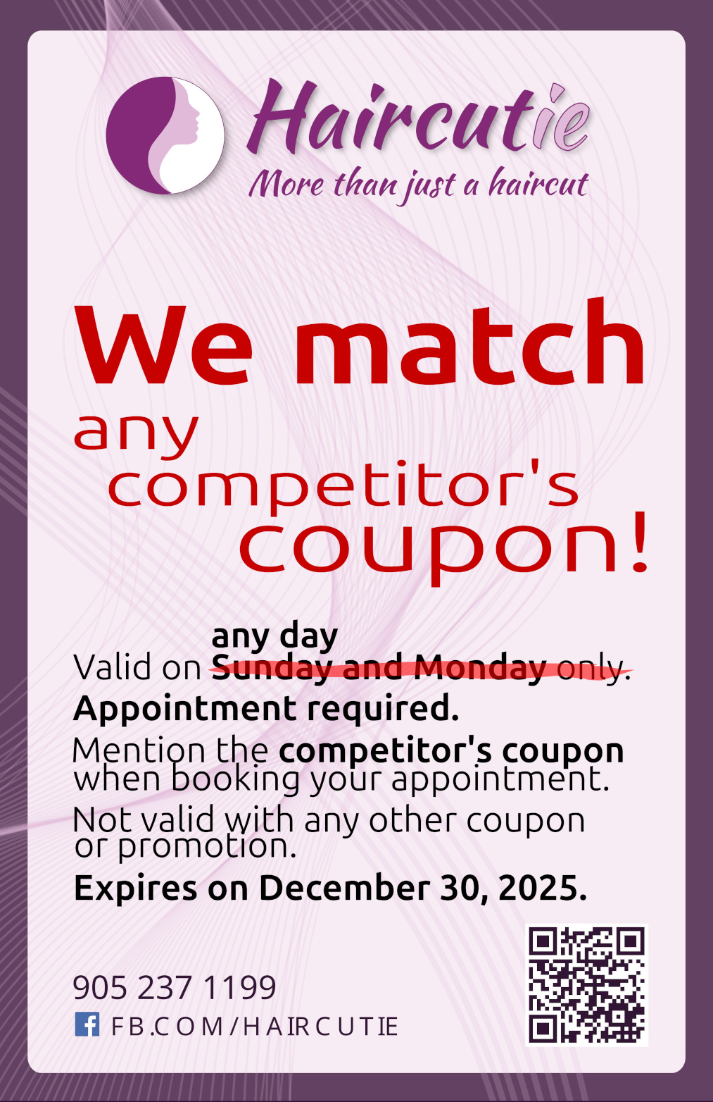 Bring a coupon from any local salon, and we’ll honor it — while giving you that signature Haircutie comfort, care, and style you already know and love.